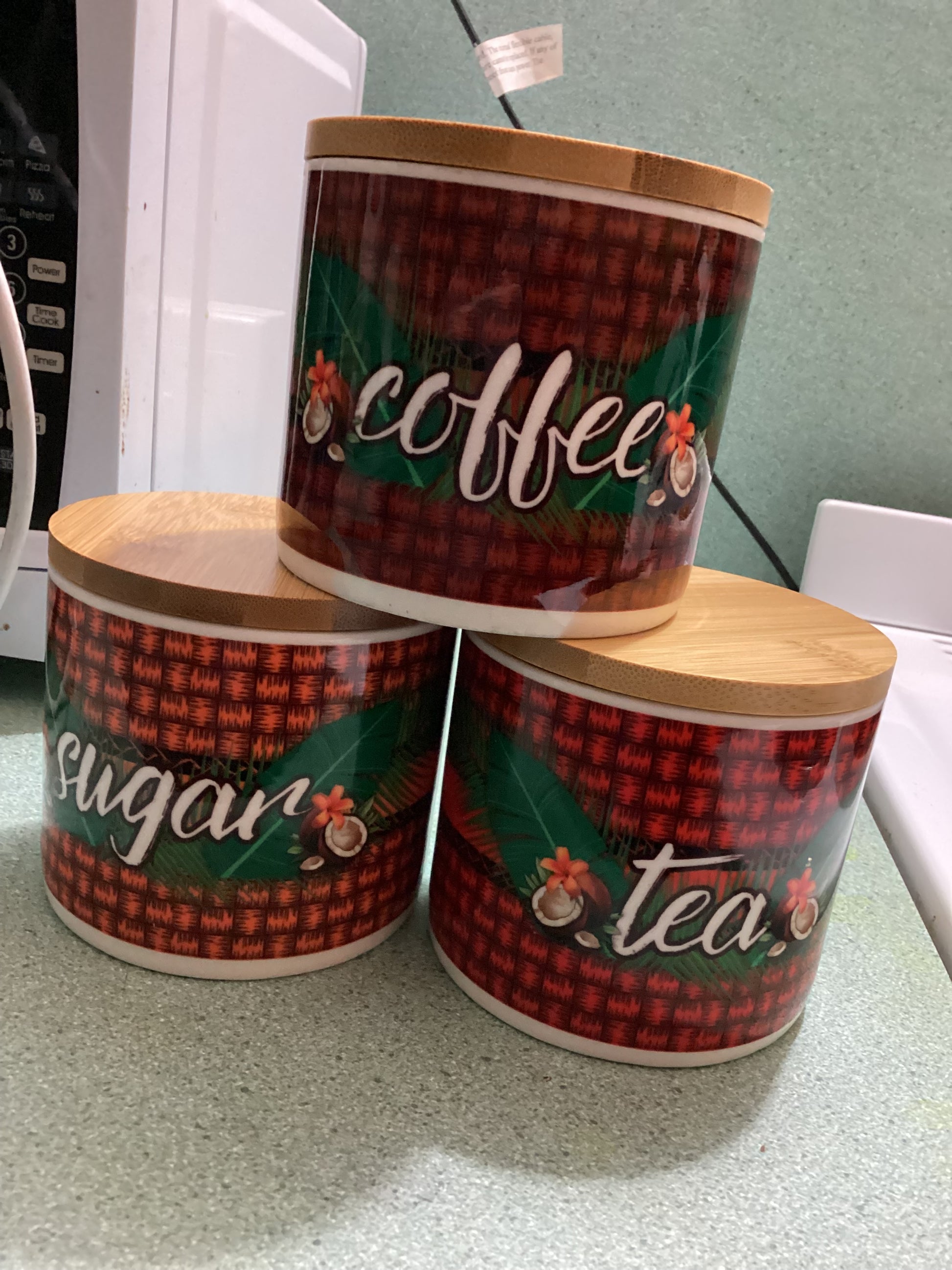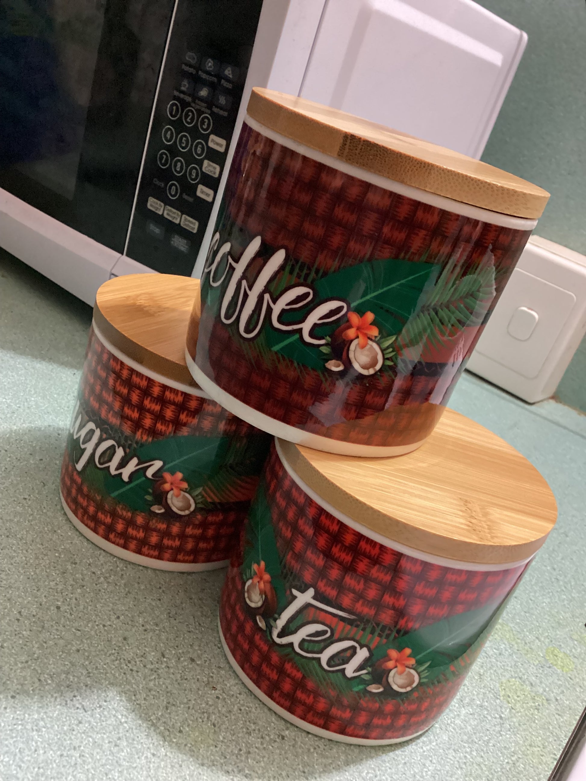 3 piece Porcelain Set with bamboo lids to store your tea, coffee & sugar.